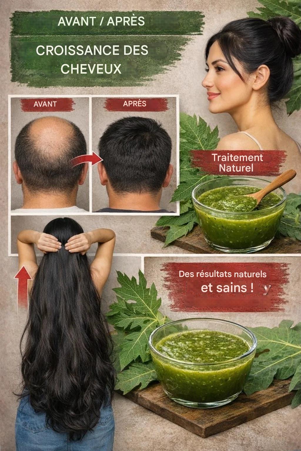 Les feuilles de papaye sont riches en antioxydants, en vitamines A, C et E, ainsi qu’en enzymes naturelles qui stimulent la circulation sanguine au niveau du cuir chevelu. Ces composants contribuent à :