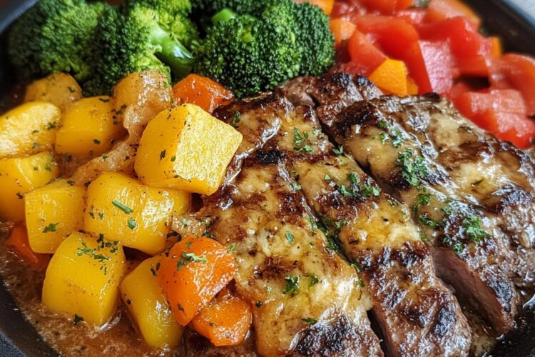 L’association d’ un steak juteux , de poivrons caramĂ©lisĂ©s , de pommes de terre dorĂ©es au beurre Ă l’ail et de brocolis nappĂ©s de cheddar fondu offre une explosion de saveurs Ă chaque bouchĂ©e. De plus, c’est plus facile Ă prĂ©parer qu’il n’y paraĂ®t.