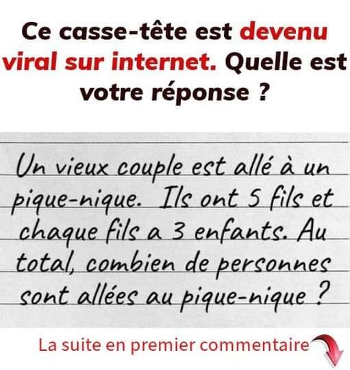 Un couple de personnes âgées est allé pique-niquer. Ils ont 5 fils, et chaque fils a 3 enfants. Au total, combien de personnes sont allées pique-niquer ?