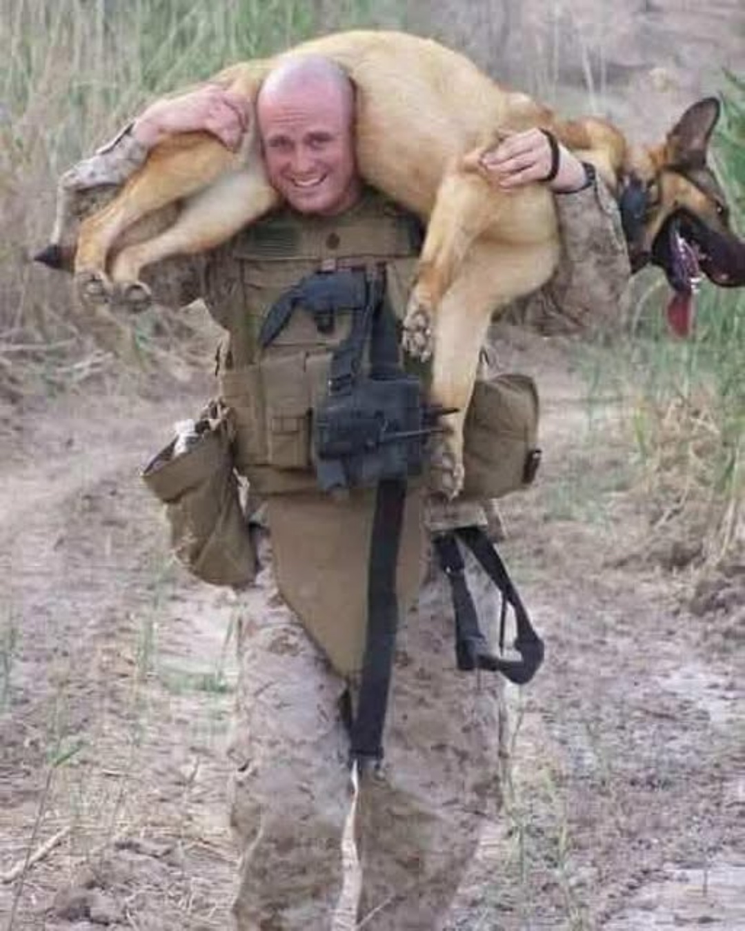 Très vite, l’allure du chien change. Ses coussinets, brûlés par le sol surchauffé, ne le portent plus. Il ralentit, montre des signes de douleur, puis finit par s’effondrer, tremblant de fatigue. Avancer était désormais hors de question. Le militaire, parfaitement conscient du danger à rester sur place, aurait pu choisir de l’abandonner. Mais cette idée ne lui a même pas effleuré l’esprit.