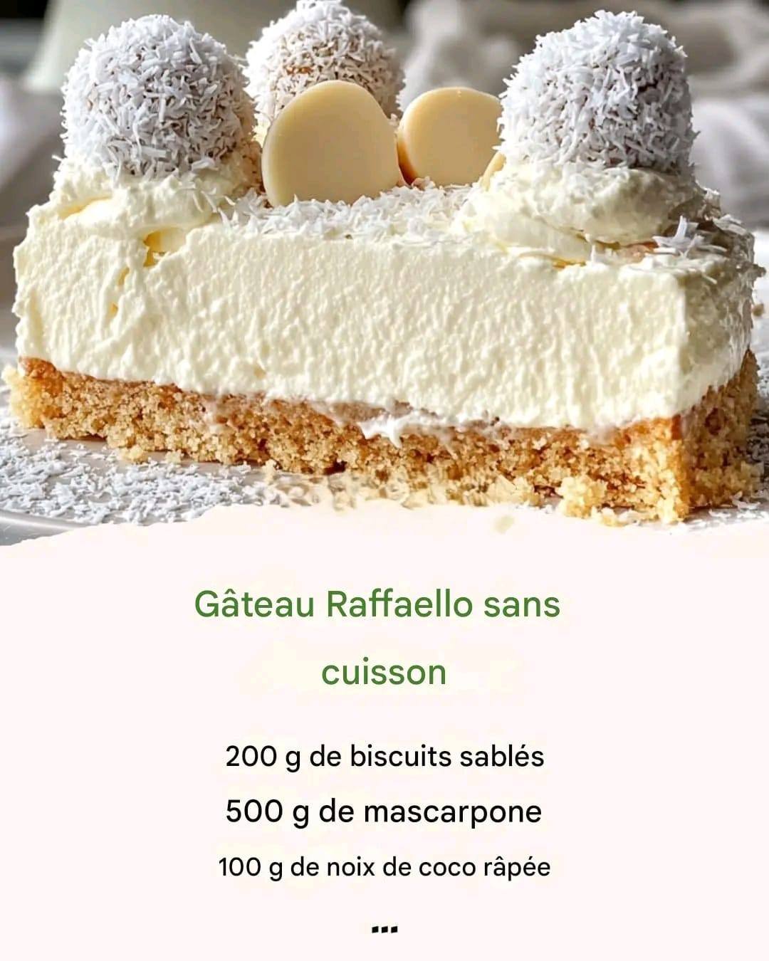 2- Préparez la crème : Mélangez le mascarpone, le sucre glace et la noix de coco râpée jusqu’à ce qu’ils soient lisses. Bats la crème fouettée jusqu’à ce qu’elle soit dure et incorpore doucement le mélange de mascarpone. Incorporez des boules de Raffaello hachées.